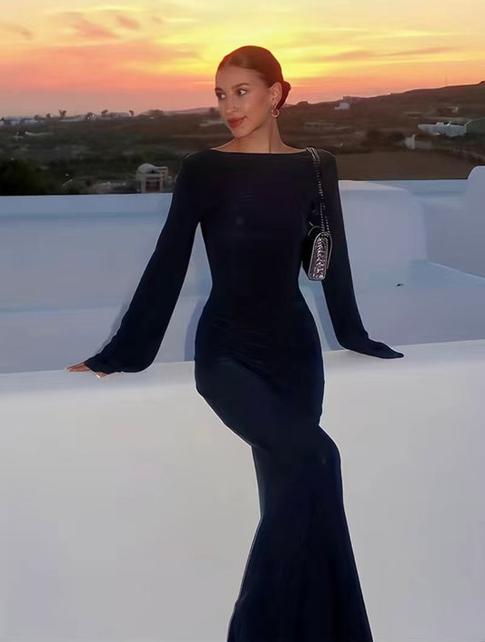 Fall is around the corner so I decided to add this beautiful, long, backless dress to the shop. I paired it with a clean line, top handle black bag, black golden ring and an elegant pair of these multilayer earrings.